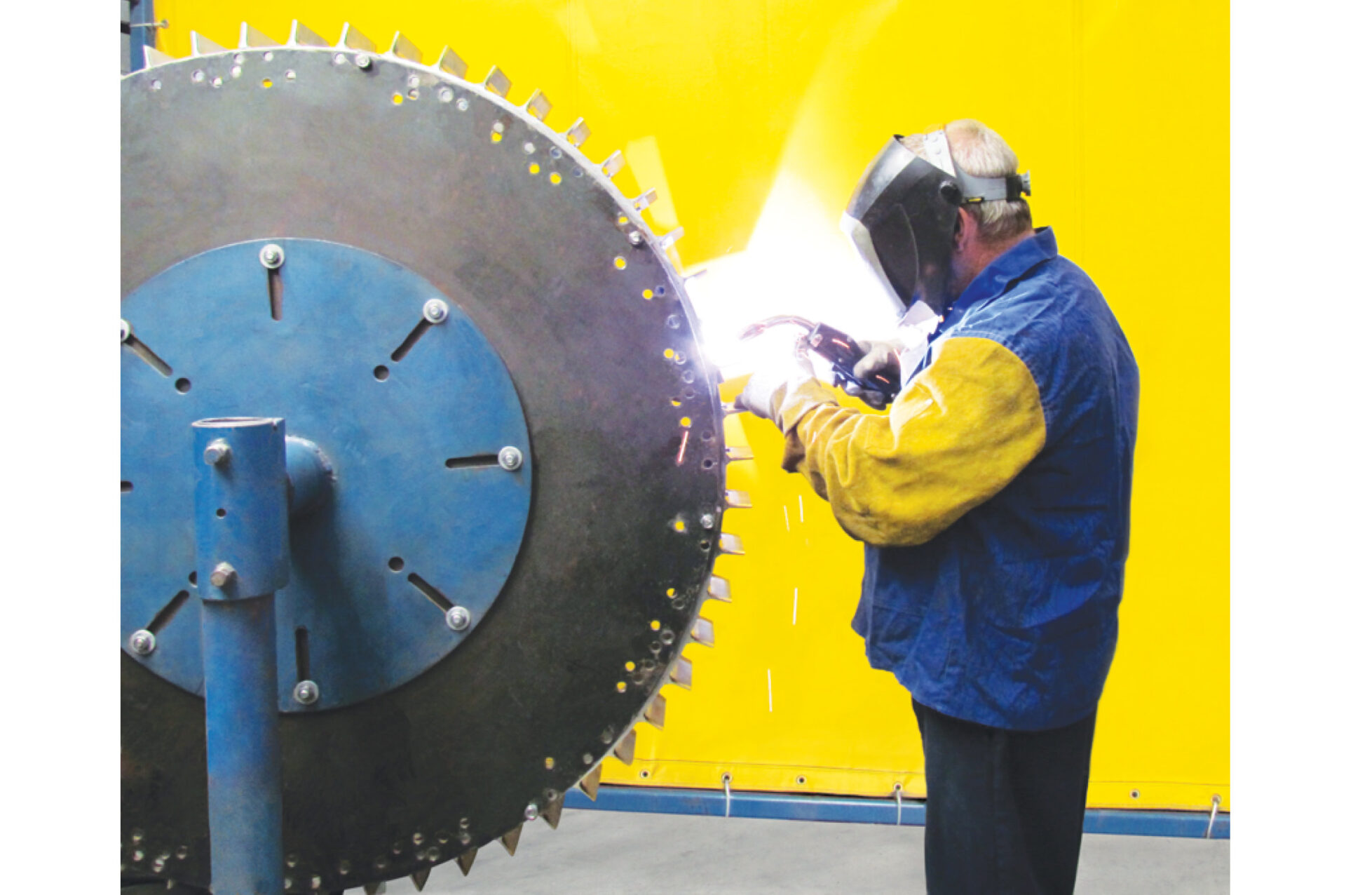 Following tack welding on the assembly fixture, the end section is transferred to the weld fixture faceplate where each individual component is clamped in place for final MIG welding.